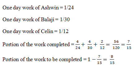 3) Ashwin can do a piece of work in 24 days. Balaji can do the same work in 30 days. Celin can do the same work in 12 days. Ashwin and Balaji started the work and worked for 4 days and they left. Then Celin alone do the work for 2 days. What is the total portion of the work to be completed?