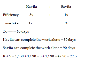 4) Kavita is thrice as efficient as Savita. Kavita can complete a work in 60 days less than Savita. In how man day the work will be completed if they work together?