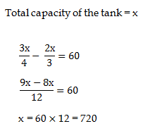 2) 3/4th of the tank filled with wine. After taking 60 litres on wine the tank is 2/3rd part full. What is the capacity of (in litres) of the tank?