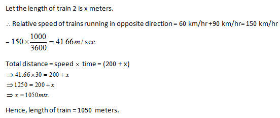 6) Two trains running in opposite directions speed of 60 km/h and 90 km/h crosses each other in 30 sec. If the length of train 1 is 200 meters. Find the length of train?