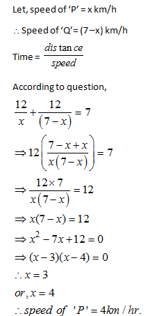 11) ‘P’ is faster than ‘Q’. ‘P’ and ‘Q’ each walk 12 km. The sum of their speed is 7 km/h and the sum of times taken by them is 7 hours. Then P’s speed is equal to.