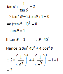 14)  If tan θ + (1/ tan θ) = 2 then the value of 2 sin2 θ + 4 cos2 θ = ?
