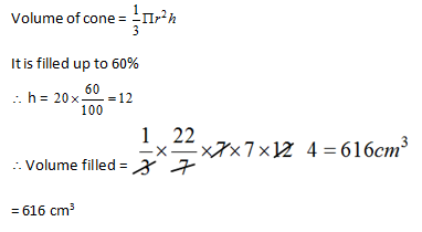 10) A conical vessel of radius 7 cm has height of 20 cm. It is filled upto 60% of height by water. How much volume water (in cubic cm) is filled in it?