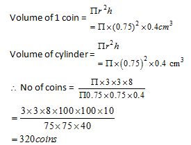 9) The number of coins of diameter 1.5 cm and thickness 0.4 cm required to be melted to make a right circular cylinder of height 8 cm and base radius 3 cm is.