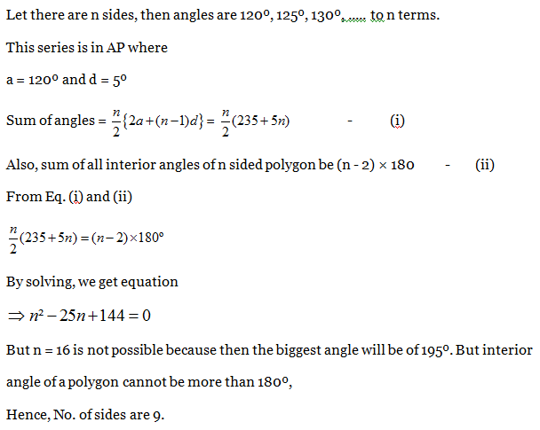 8) The interior angles of a polygon are in Arithmetic Progression. If the smallest angle is 120º and common difference is 5º, then number of sides in the polygon is: