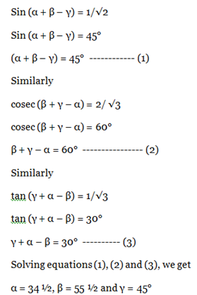 15) If each, α, β, γ is positive acute angle such that sin (α + β – γ) = 1/ = 1/√2, cosec (β + γ – α) = 2/ √3 and tan (γ + α – β) = 1/√3. What are the values of α, β, γ?