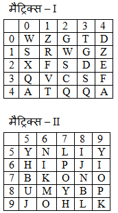 7) एक शब्द केवल एक संख्या – समूह दुवारा दर्शाया गया है, जैसा की विकल्पों में से किसी एक में दिया गया है। विकल्पों में दिए गए संख्या – समूह अक्षरों के दो वर्गो द्वारा दर्शाए गए है, जैसा की दिए गए दो आव्युहों में है। आव्यूह – I के स्तम्भ और पंक्ति की संख्या 0 से 4 और आव्युहों – II की 5 से 9 है। इन आव्युहों में एक अक्षर को पहले उसकी पंक्ति और बाद में स्तम्भ संख्या द्वारा दर्शाया जा सकता है। उदाहरण के लिए ‘Y’ को 55, 87 आदि द्वारा दर्शाया जा सकता है तथा ‘Z’ को 14, 01 आदि द्वारा दर्शाया जा सकता है इसी तरह से आपको प्रश्न में दिए गए शब्द ‘VERY’ के लिए समूह को पहचानना है।