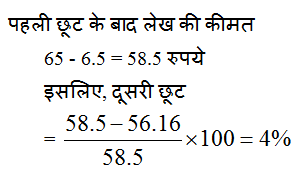 10) एक वस्तु का अंकित मूल्य 65 रुपये है। एक ग्राहक ने 56.16 रुपये के लिए इस वस्तु को खरीदा और दो लगातार छूट मिली जिनमें से पहला 10% है। दुकानदार द्वारा इस योजना की छूट की दूसरी दर क्या थी?