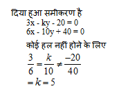 15) समीकरण 3x – ky – 20 = 0 और 6x – 10y + 40 = 0 का कोई समाधान नहीं तो k का मान होगा?