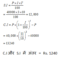 10) साधारण ब्याज और चक्रवृद्धि ब्याज (वार्षिक रूप से संयोजित) के बीच 40000 रुपये पर 3 साल के लिए 10% प्रतिवर्ष पर क्या अंतर होगा?