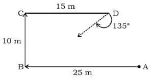 Direction (7-8): Asmitha started walking for distance of 25 m from point A to point B, and then she turned to the right and walked 10 m and reaches point C. She then again turned to the right and walked 15 m to reach D. After this she turned right at an angle of 135° and travels 30 m in southwest direction.