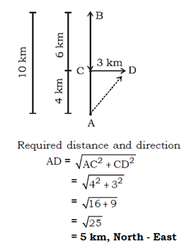 2) A walks 10 km towards north. From there he turned 180o clockwise and walks for 6 km. Then he takes left turn and walks 3 km. How far and in which direction is he from his starting point?