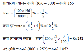 1) 800 रुपये साधारण ब्याज की एक निश्चित दर पर 3 वर्ष में 956 रुपये हो जाते हैं। यदि ब्याज की दर में4% की वृद्धि हुई है,तो 800 रुपये की राशि 3 वर्ष में कितनी हो जाएगी?