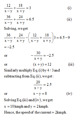 माना की नाव की गति और धारा की गतिक्रमश: x किमी प्रति घंटे और y किमी प्रति घंटे है
