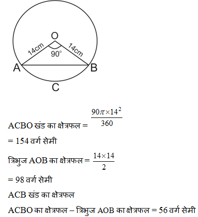 13) AB14 सेमी त्रिज्या के एक वृत्त का कोर्ड है। कोर्ड सर्कल के केंद्र में समकोण बनाता है। छोटे वृत्त खंड का क्षेत्रफल ज्ञात कीजिये।