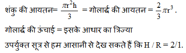 14) एक शंकु और गोलार्द्ध के बराबर आधार और बराबर आयतन है। उनके ऊंचाइयों का अनुपात ज्ञात कीजिये।