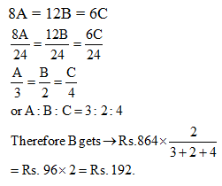 06) 864 रुपये को A, B और C के बीच विभाजित है जैसे कि 8 गुणा A का हिस्सा 12 गुना B के बराबर है और 6 गुणा C के बराबर है। B को कितना मिला?