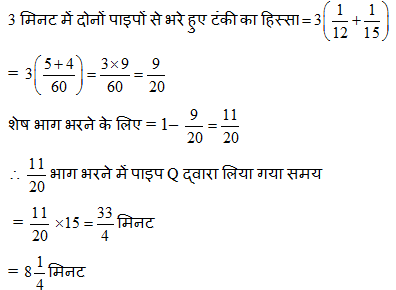 07) दो पाइप, P और Q क्रमशः 12 और 15 मिनट में एक हौज को भर सकते हैं। यदि दोनों एक साथ खोले जाते हैं और 3 मिनट के अंत में, पहला बंद हो जाता है, तो भरने के लिए कितना समय लगेगा?