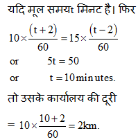 09) ट्रिशा 10 किमी प्रति घंटे कार्यालय जाती है और 2 मिनट देर से कार्यालय तक पहुंच जाती है। यदि वह 15 किमी प्रति घंटे की दूरी से जाती है तो वह नियमित समय से 2 मिनट पहले कार्यालय तक पहुंच जाती है।उसके कार्यालय की दूरी क्या है