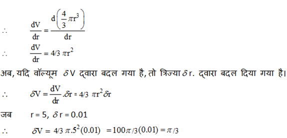 4) एक खोखले गोलाकार धातु की खोल की आयतन ज्ञात करें जिसकी मोटाई 0.01cm सेमी है और आंतरिक त्रिज्या 5 सेमी है|