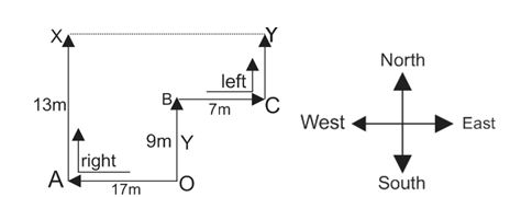 10) X और Y एक ही बिंदु से शुरुआत करते हैं। X पश्चिम की ओर 17 मी तक चलता है, फिर अपने दाहिने ओर मुड़ जाता है और 13 मी तक चलता है। उसी समय, Y उत्तर की ओर 9 मी तक चलता है, फिर पूर्व की ओर मुड़ जाता है और 7 मी तक चलता है, फिर अपनी बाईं ओर मुड़ जाता है और 4 मी तक चलता है। X की स्तिथि से अब Y कहाँ पर है?
